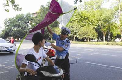 盛夏季节,骑车怕晒,不少市民在电动车上安装遮阳伞,殊不知会带来安全隐患。昨天,交警部门对加伞电动车进行专项整治,现场收缴非法加装遮阳伞56把。(记者冯婷、吴延)