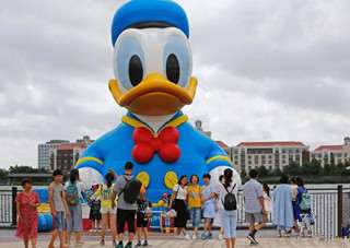 昨日,一只11米高的巨型唐老鸭“游”进了上海迪士尼度假区的星愿湖,吸引了大人和孩子的目光。它穿着标志性的蓝色水手服,撅着黄澄澄的大嘴巴。(中新网)