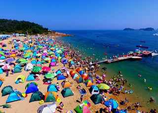22日,约4万游客聚集到大连市付家庄海滨浴场消暑避夏,在海滩上支起花花绿绿的帐篷,整个海滩如同“下饺子”。(中新网)