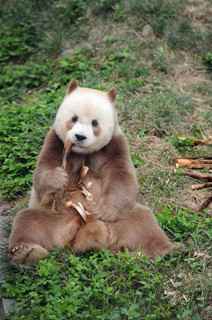 ★近日,大熊猫七仔在陕西省珍稀野生动物抢救饲养研究中心内吃竹笋。9岁的七仔为秦岭亚种大熊猫,它的皮毛是棕白色的,因为极其罕有,又被称为“宝中之宝”。(中新网)