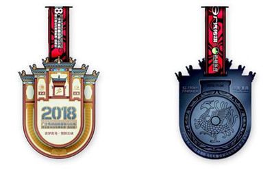 2018宜昌国际马拉松奖牌昨日公开亮相,奖牌设计为“线下马拉松+线上马拉松”组合奖牌,线下奖牌以楚文化代表人物“屈原”故居为主形象,使用楚玉佩外形进行辅助。线上奖牌以楚人精神图腾“凤”为图案,以瓦当为外形。(记者高然)