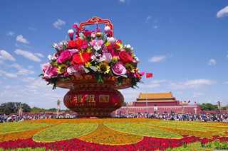 ★23日,北京天安门广场国庆主题花篮“祝福祖国”正式亮相。花坛顶高17米,花坛底部直径50米。花篮里有红掌、梅花、康乃馨、向日葵、兰花、月季等多种仿真花卉,寓意幸福吉祥。(中新网)