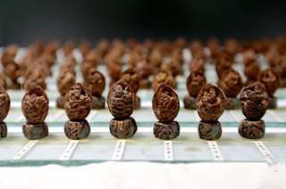★西安群众艺术馆内昨展出“水浒一百零八将”核桃雕刻。这些核桃雕刻的作者是今年55岁的蔡青柱,他用时两年在108个鹌鹑蛋大小的核桃上雕刻了一套《水浒》108将,造型各异、图案精美。(中新网)