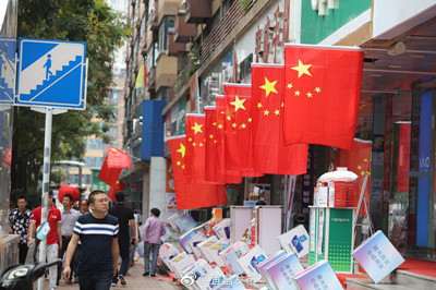 昨日,城区东山大道手机一条街,商家们纷纷在自己的店面门口悬挂起国旗,为祖国庆生,祝愿祖国繁荣富强,鲜艳的五星红旗迎风飘扬,既装扮了节日的气氛,又吸引了过往的市民。(记者吴延)