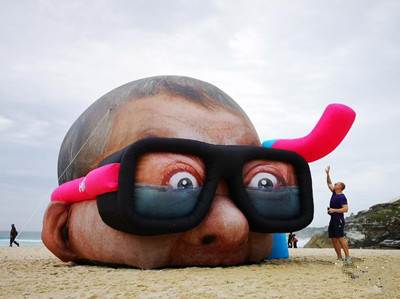 18日,第22届澳大利亚邦迪海滩雕塑展在悉尼邦迪海滩开幕。巨型人像雕塑作品吸引参观者。(中新社)