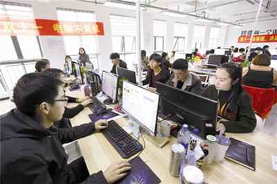 截至11日1时,湖北“双11”的成交额排名全国各省份第8位,宜昌的消费力在全省排名第三。图为昨日,枝江电商产业园麦芒信息科技有限公司工作人员全力奋战。该公司挂出“决战双十一,电脑不关机”的宣传标语,11日当天销售额超过亿元。(记者黄余洋)