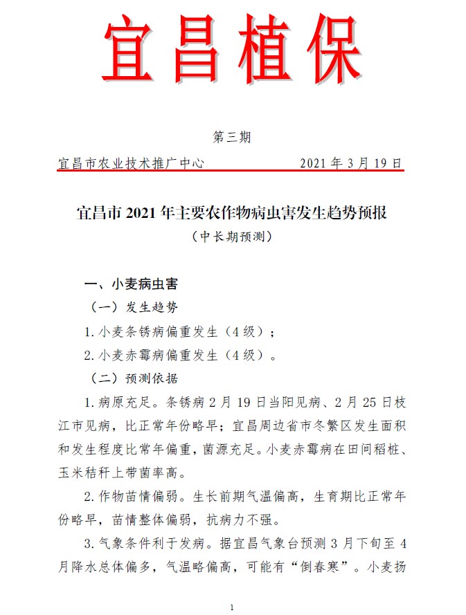 宜昌植保2021年第三期 宜昌市2021年主要农作物病虫害发生趋势预报
