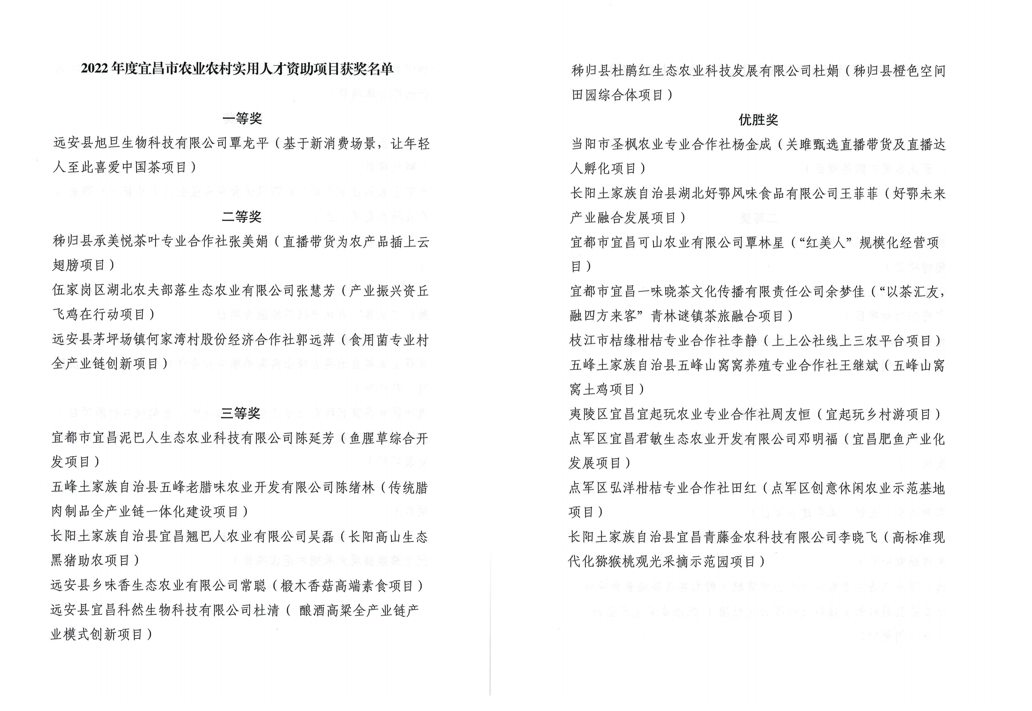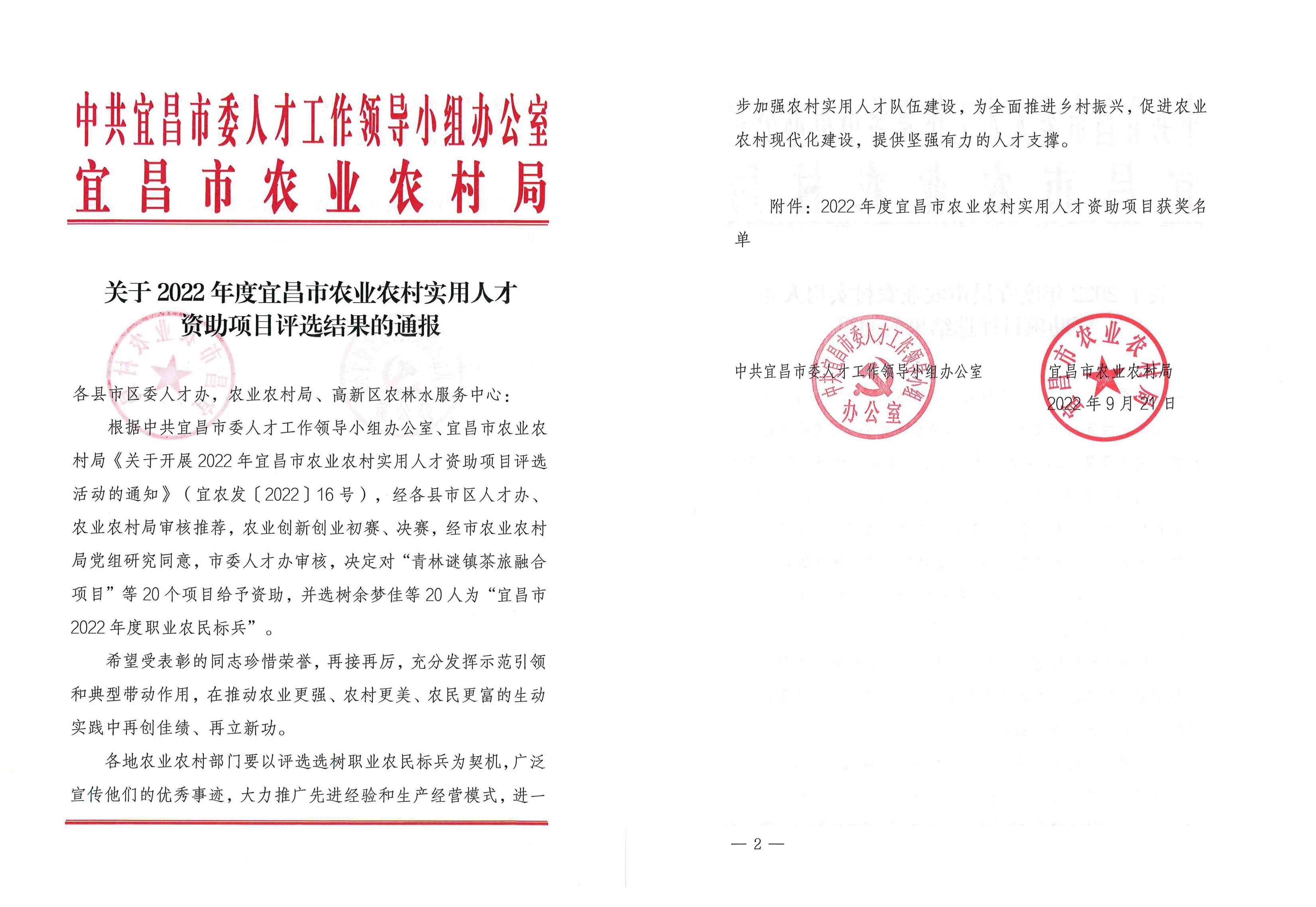 2022年度宜昌市农业农村实用人才资助项目评选及农业创业创新大赛结果的通报