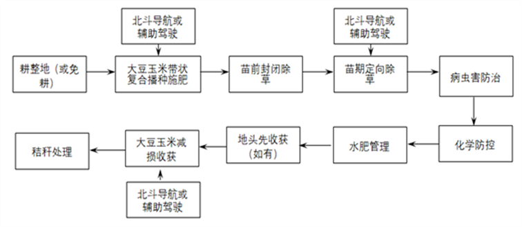 大豆玉米带状复合种植全程机械化技术通过机械化精量播种、苗期综合管理、减损收获等关键技术配套,降低劳动强度,提高作业效率,实现高产高效。技术路线如下: