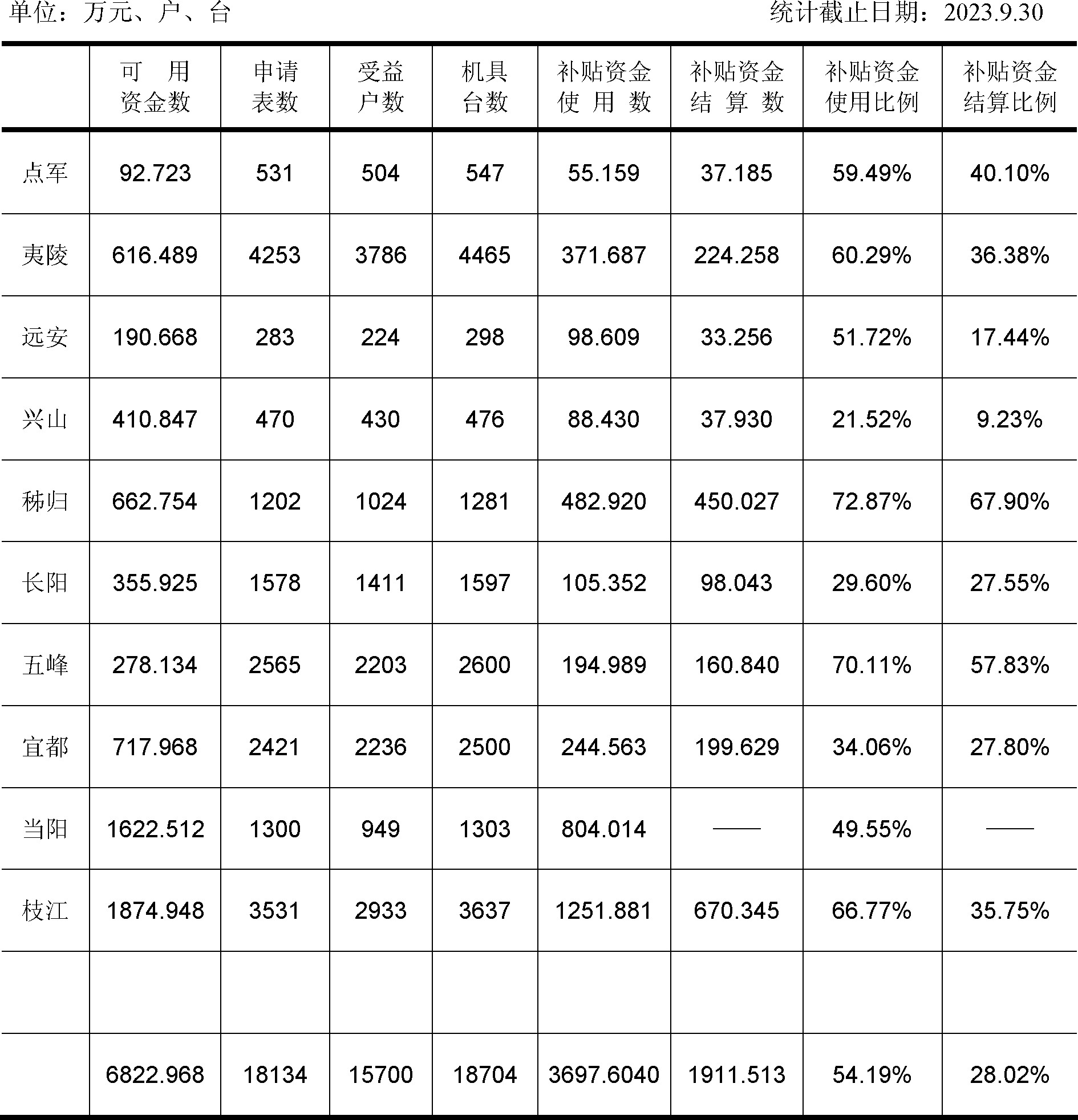 宜昌市农机购置补贴资金使用进展情况(9月)