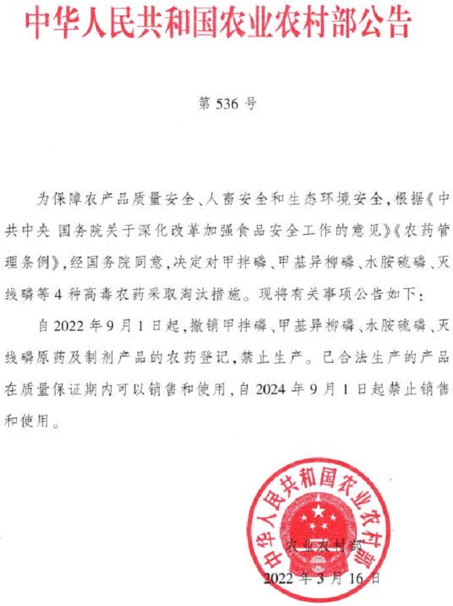 农业农村部公告第536号规定:自2022年9月1日起,撤销甲拌磷、甲基异柳磷、水胺硫磷、灭线磷原药及制剂产品的农药登记,禁止生产,自2024年9月1日起禁止销售和使用。