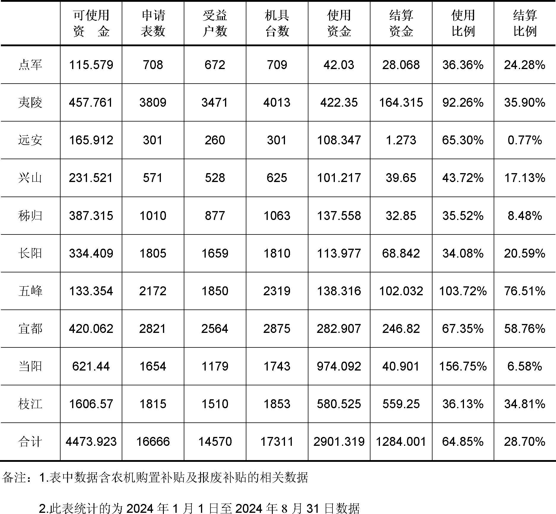 2024年中央下达宜昌市第一批农机购置补贴资金 3809万元,加上部分县市2023年接转资金,扣减部分县市2023年超录资金,目前全市2024年可使用农机购置补贴资金4473.923万元。截至2024年8月31日,全市先后接受14570个农户(经营主体)提交购机(或报废)申请16666份,支持购置(或报废)各类农机17311台套,使用补贴资金2901.319万元,使用比例占64.85%;其中结算资金1284.001万元,结算比例28.70%。