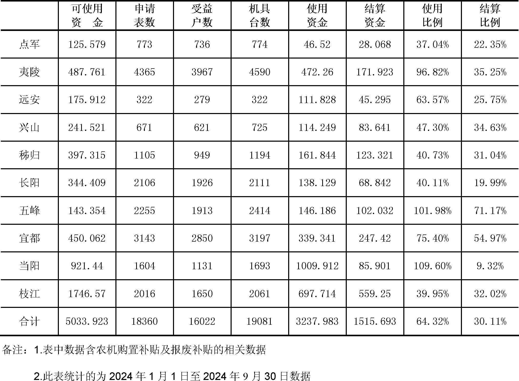 截至2024年9月30日,全市先后接受16022个农户(经营主体)提交购机(或报废)申请18360份,支持购置(或报废)各类农机19081台套,使用补贴资金3237.983万元,使用比例占64.32%;其中结算资金1515.693万元,结算比例30.11%。