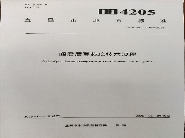 由市农技中心联合有关单位共同制定的宜昌市地方标准《昭君眉豆栽培技术规程》(DB 4205/T139-2025),于2025年4月10日正式发布,2025年5月9日起实施。