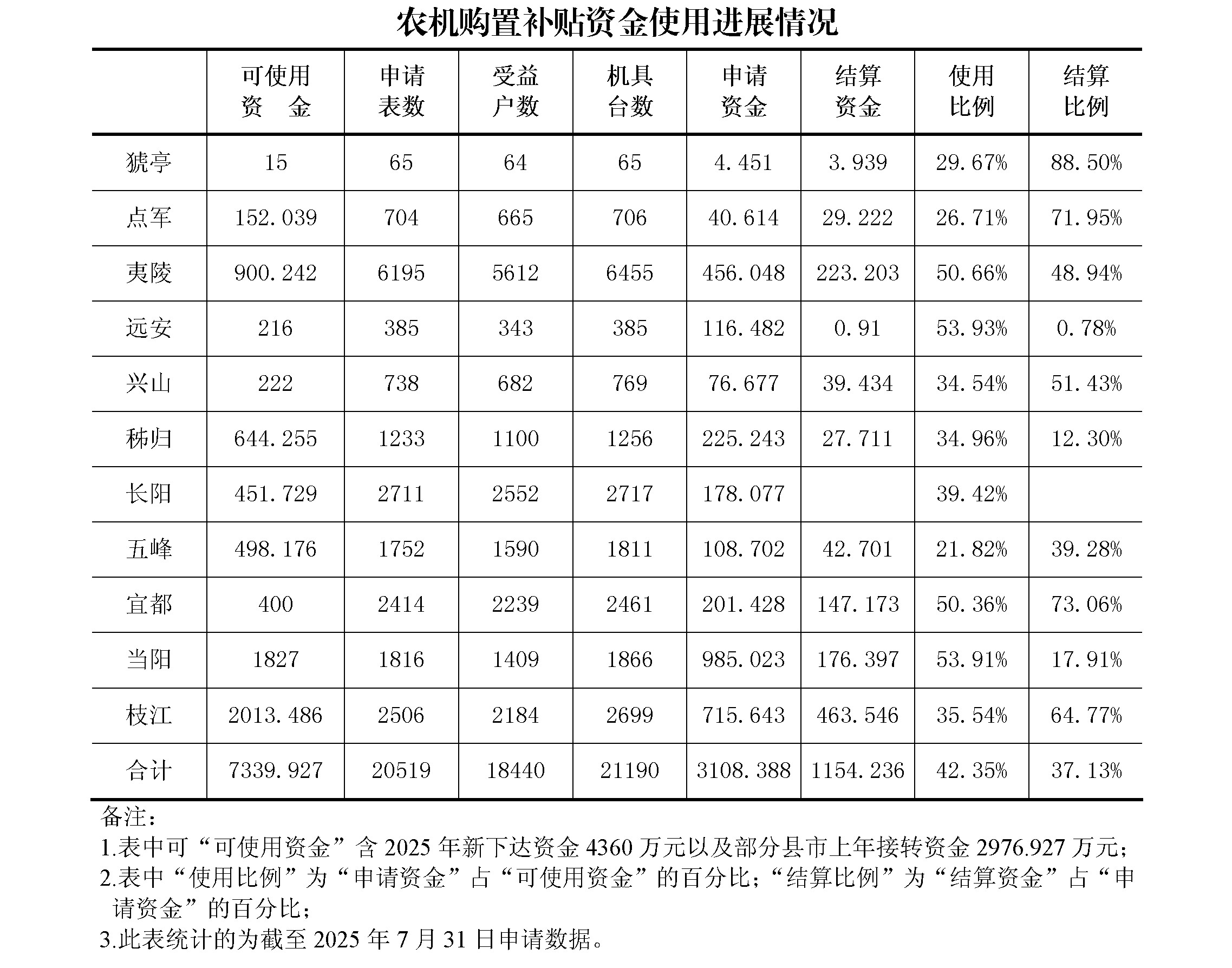 2025年中央下达宜昌市两批农机购置补贴资金4363万元,部分县市接转资金2976.927万元,目前全市农机购置补贴可使用资金达到7339.927万元。