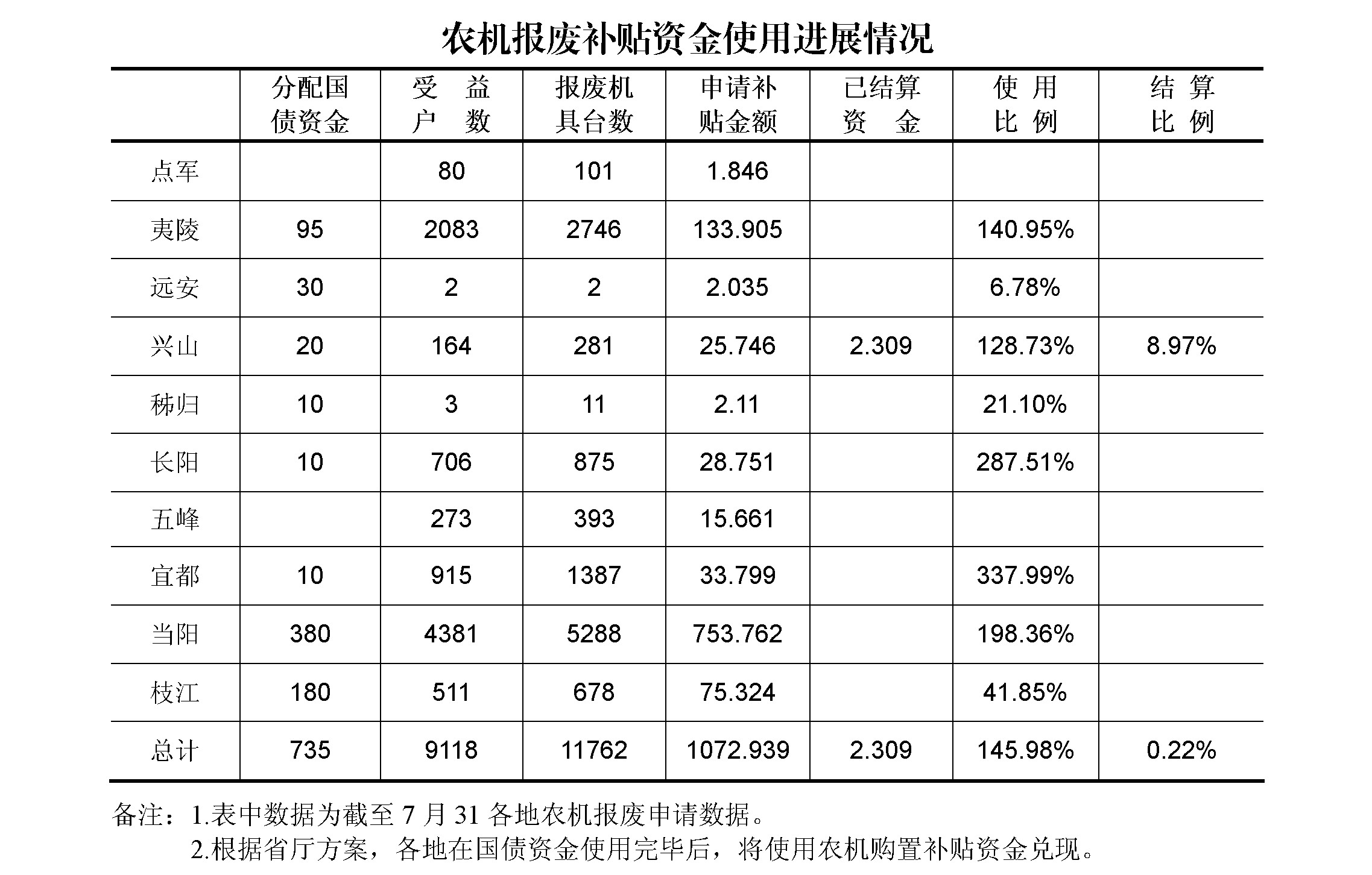 2025年省厅下达宜昌市农机报废补贴特别国债资金735万元。截至7月31日,全市先后接受9118个农户(经营主体)提交农机报废补贴申请,报废各类农机11762台套,申请补贴资金1072.939万元,资金使用率145.98%;其中兑现2.309万元,资金结算率0.22%。