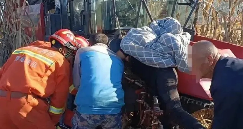 事故隐患:收割机在作业过程中,辅助人员与其他人员进入作业场地跟随收割机捡拾玉米或察看收获情况,因农机驾驶人在操作过程中存在视觉盲区,易造成收割机在倒车过程发生碾压事故。