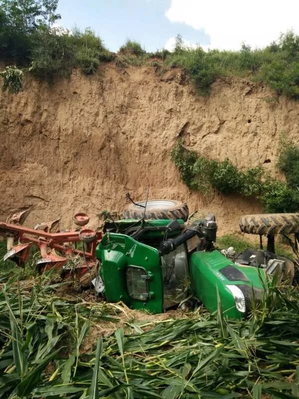 事故隐患:农机驾驶人驾驶收割机在沟壑、棱边、暗坑周边进行收获作业或转移作业过程中,当无法避免收割机发生倾翻事故时,农机驾驶人从倾翻方跳车逃生时,易造成二次压塌伤人事故。