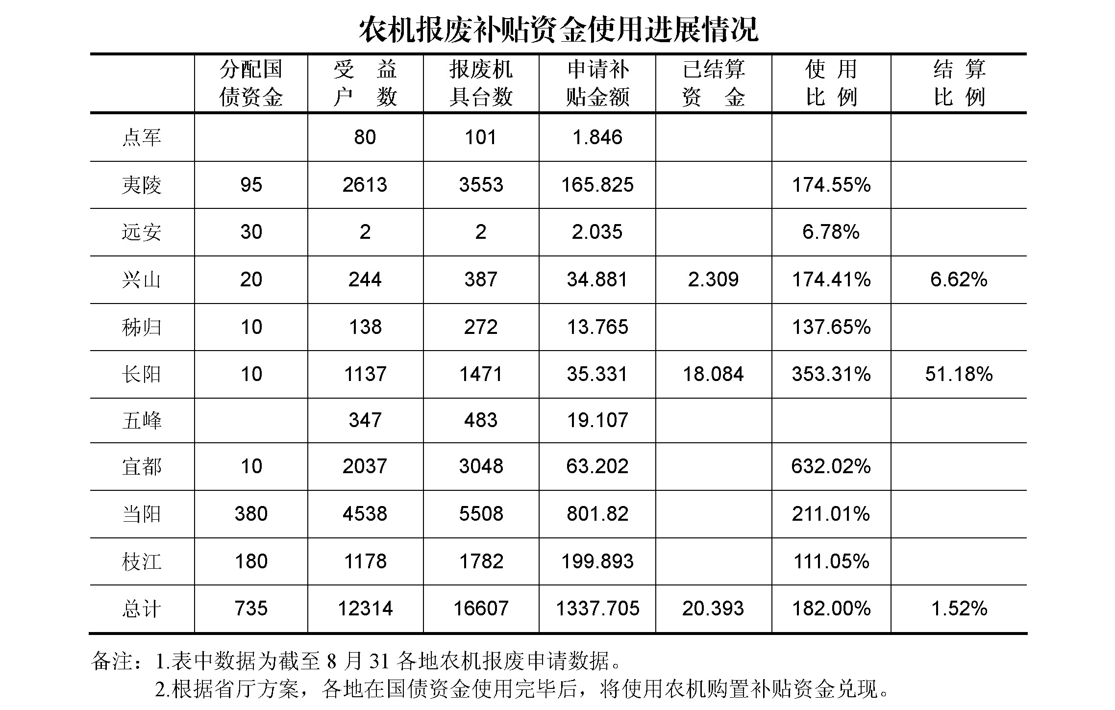 2025年省厅下达宜昌市农机报废补贴特别国债资金735万元。截至8月31日,全市先后接受12314个农户(经营主体)提交农机报废补贴申请,报废各类农机16607台套,申请补贴资金1337.705万元,资金使用率182.00%;其中兑现20.393万元,资金结算率1.52%。