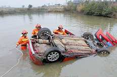 昨日13时许,256省道枝江问安段,一辆长城牌红色小汽车坠入路边鱼塘内,四轮朝天。驾驶车辆的中年男子被甩出车外,不幸遇难,困在车内的5岁女童成功获救,不停哭喊着要爸爸。据现场村民介绍,事发前听到一声巨响,随后看到该车失控,疑是爆胎所致。(记者王夙志)