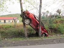 昨日早上,当阳一名女司机驾车上班途中,因车速过快,刹车过急,导致车头着地,然后翻转180度,腾空撞上路边的树后才停下来,而车尾则架在树上,所幸并无人员伤亡。交警表示,司机系了安全带,不然这样的撞击,将会对乘员造成严重伤害。(记者钟良)