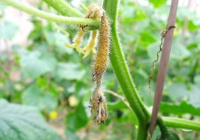 灰霉病害发生早,流行快,在每年三四月份达到高峰期,主要危害幼果、幼瓜,常导致幼果、幼瓜迅速变软、萎缩、腐烂,表面密生灰色霉层。幼果、幼瓜附着在茎上时,能引起茎部腐烂。病株率和病果率在7~10天内暴发流行。