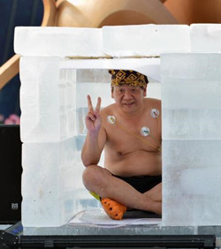 昨日,来自湖南的耐寒奇人潘一中进入冰屋,开始极限冰冻耐寒生存大挑战。当天,包括潘一中在内的4名中国耐寒奇人在长沙参加了这一挑战,他们将在极寒密闭、不到三尺见方的冰立方内不吃不喝足足“蜗居”三天。(中新社)