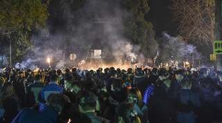 今日,洛阳“千年古刹”白马寺举行一年一度的祈福敲钟仪式,为拔得头筹,零点前后,有近万名游客陆续涌进白马寺,排队敲响2017新年钟声,现场烧香拜佛人群拥挤,雾霾天气下烟雾缭绕。为防止踩踏事件,现场有武装保卫人员维持秩序。(视觉中国)