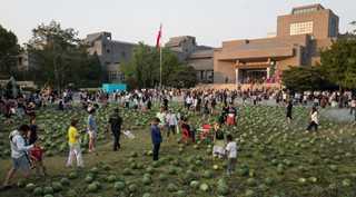 昨日,中央美术学院草坪一夜间被西瓜铺满,吸引不少“吃瓜群众”。据悉,这是学校在本科生毕业作品展前,送给学生的“小惊喜”,共耗用3500个西瓜。西瓜在毕业作品展开幕后就赠送给了毕业学生。(北京晨报)