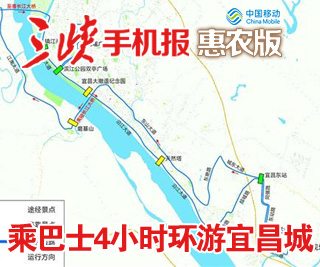 线路走向:起点站均瑶广场、夷陵大道、云集路、沿江大道、白沙路、桔城路、同强路、东山大道延伸段、宜昌规划展览馆、柏临河路、同强路、城东大道、东艳路、东山大道、夷陵长江大桥、磨基山、江南大道、至喜长江大桥、沿江大道、云集路、夷陵大道、西陵二路、东山大道至终点站均瑶广场,单环运行;途经景点:均瑶广场、滨江公园双亭广场、宜昌大撤退纪念园、天然塔、宜昌规划展览馆、宜昌东站、磨基山、镇江阁8个景点。中途停靠:均瑶广场、宜昌大撤退纪念园、天然塔、宜昌规划展览馆、磨基山等5个景点。(记者钟良)
