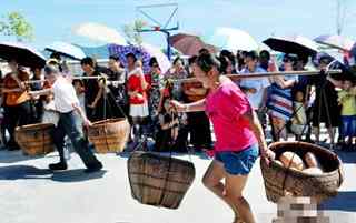 27日,游客在江西省德兴市张村乡南岸村开心参与挑南瓜比赛。据了解,南岸村自古以来就有加工制做南瓜果卖的习惯,此次开展的以南瓜为主题趣味比赛,旨在宣传当地传统农家风味特色小吃,也给时下盛行的乡村旅游文化和城里游客参与体验农家生活增加乐趣。(中新网)